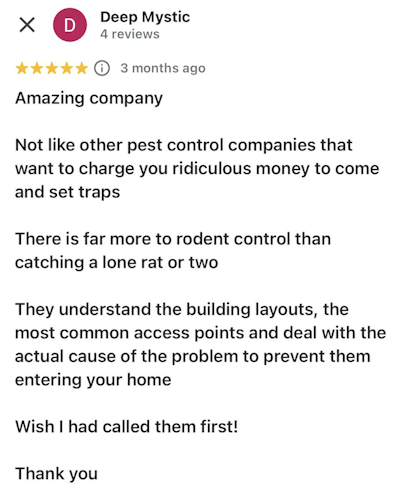 I bought and moved into my house in 2020 and after a few months, it was evident I was sharing a house with rats. They occupied the cavities in my kitchen walls, my bedroom walls, under the floorboards in my bathroom, the side extension roof where I WFH, and in the attic floorboards, which was my bedroom ceiling. It was disgusting, unbelievable, and pretty surreal. Previous controllers came out and set traps, but never really put any thought or action to determine how they were getting in, they would always leave us the task of finding out how they were getting in – not our expertise so we couldn’t put a stop to it, we aren’t qualified to climb or crawl, let alone spot common signs how they would be getting in, so we put up with it. We had to.