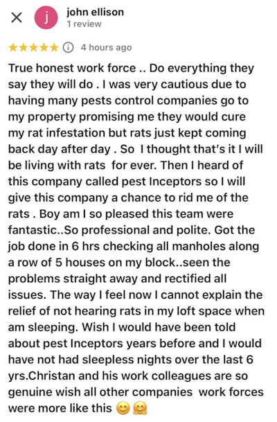 One evening, I typed ‘rats’ into the search bar on Facebook which took me to a Public Group ‘How To Get Rid Of Rats’, and the most recent post was a linked Video to YouTube by Pest Interceptors – I watched it and couldn’t believe what I watched – a possible solution! But then I thought? Nah. Why them? No one-else has been able to sort us out! Anyway, I reached out to Christian on FB and he responded almost immediately – the following evening my partner and I had probably a 1 hour conversation with Chris on the phone to explain our horrendous situation and he was our last hope.